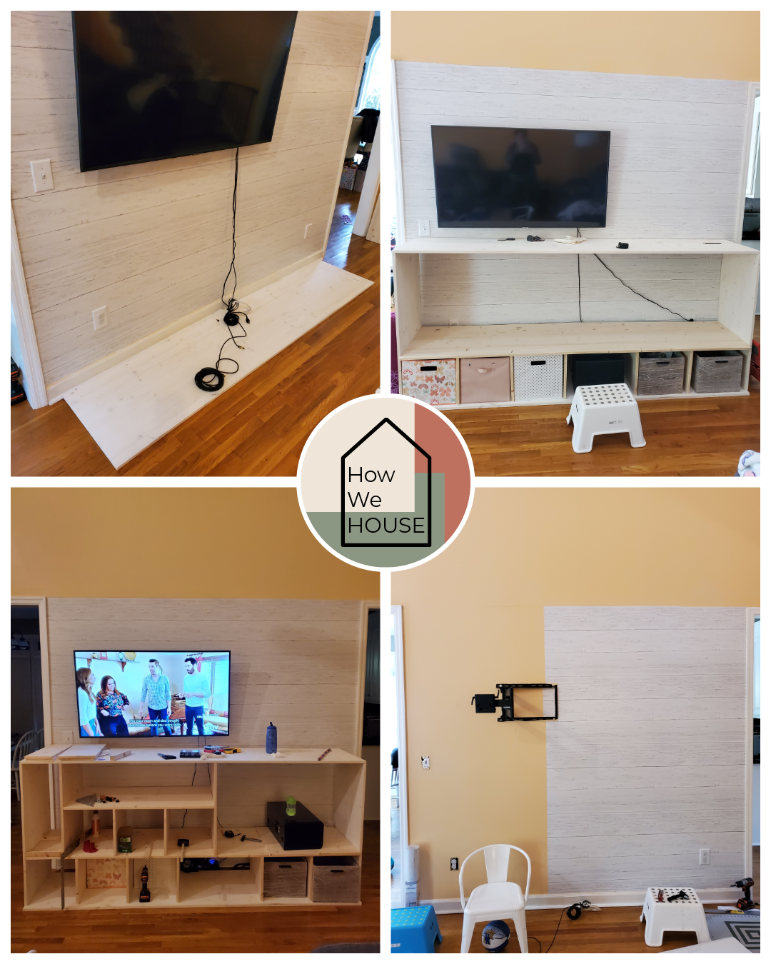 We picked up some edge-glued panels from Lowe’s and spent a few days measuring, cutting, and assembling — and finally, tada! It was done. We were exhausted, so we went for a quick white-wash finish. We weren’t thrilled with how it turned out, but the cabinet was so functional that we never got around to repainting it.
